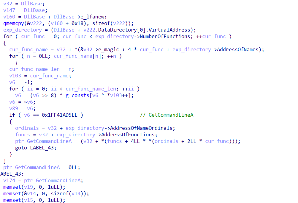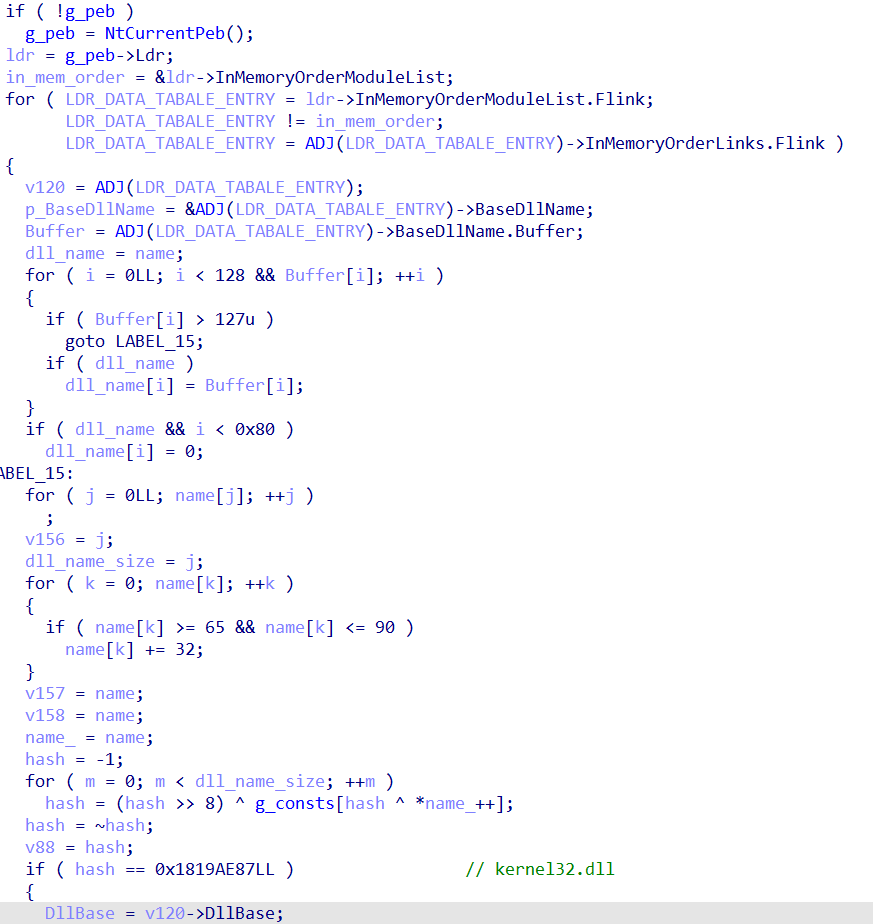PEB->LDR->InMemoryOrderModuleList to get information about the library. Then they parse the MZPE header and obtain the pointer to the export table: